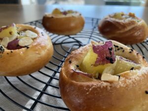 秋の味覚さつまいもをパン生地で作ったカップにいっぱいのせたお芋カップパン